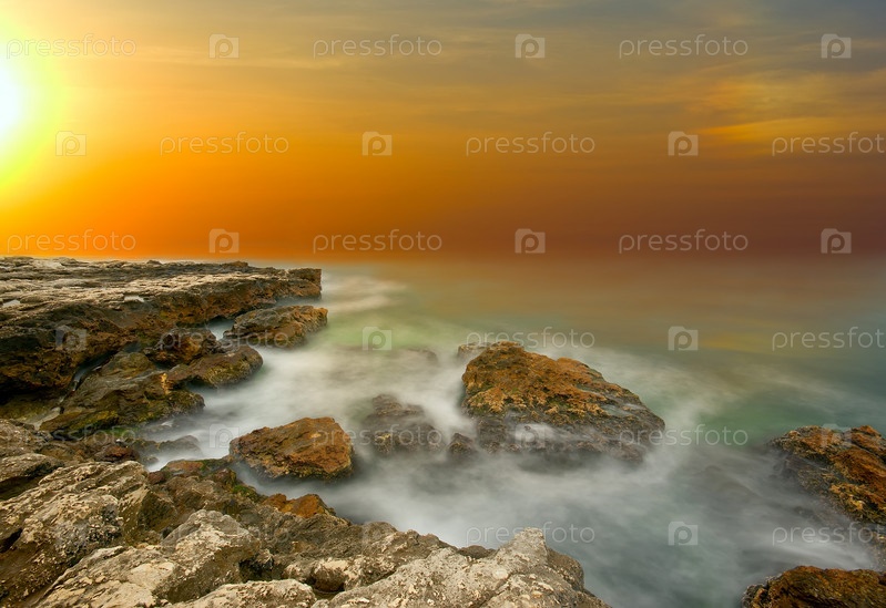Каменистый морской берег на закате