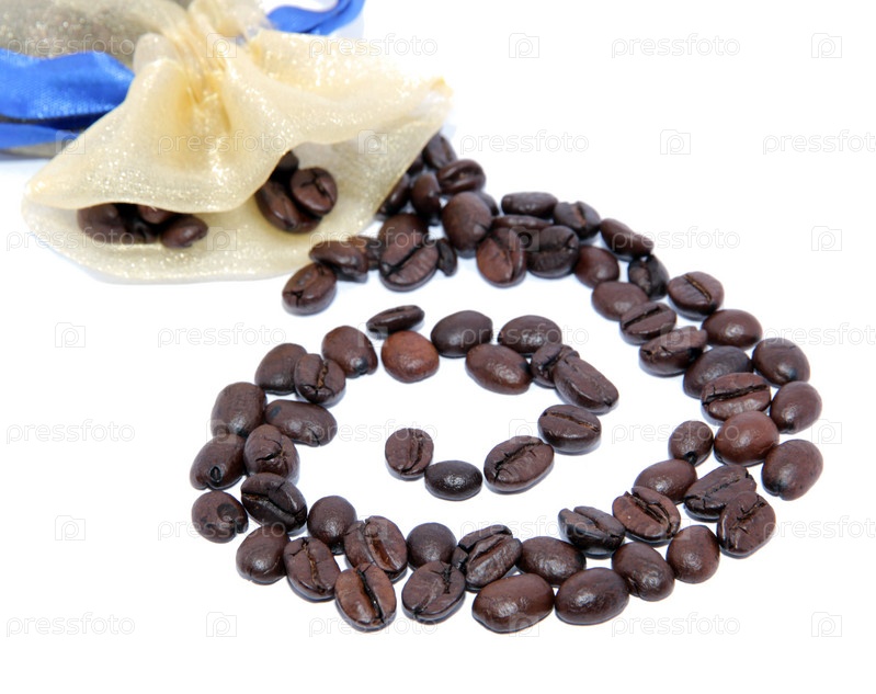 Зерна кофе высыпались из красивого пакетика
