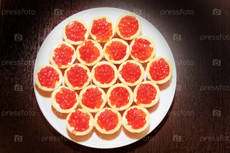 Тарталетки с красной икрой в белой тарелке на черном столе