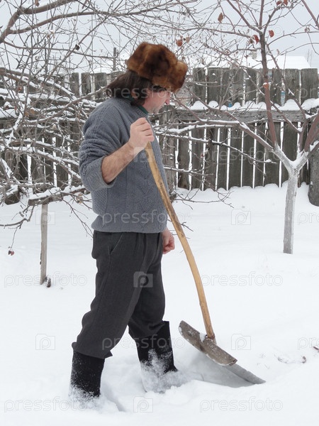 Мужчина с лопатой очищает двор от снега