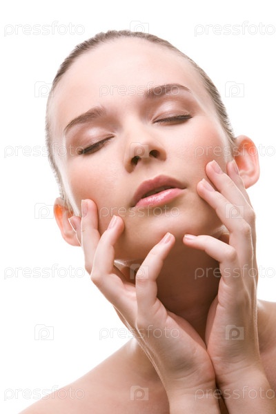 Близкий план красивой молодой женщины с закрытыми глазами, касающейся ее лица