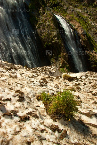 Водопады и ледники в горах летом