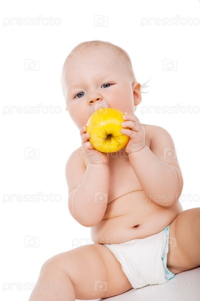 Мальчик ест яблоко.Студийный снимок.Изолирован на белом фоне