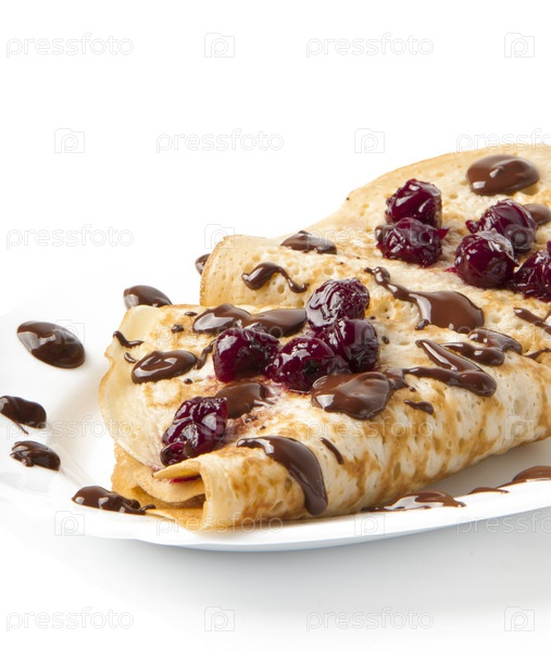 Блинчик с вишней и шоколадным сиропом на белом фоне