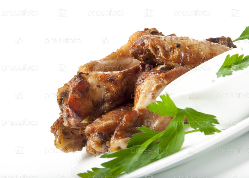 Жаренные куриные ножки с зеленью на белом фоне