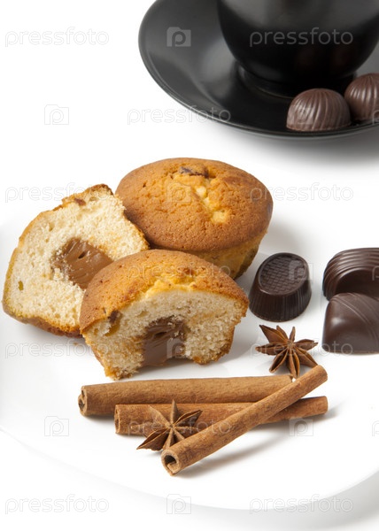 Кружка кофе, кексы и шоколадные конфеты на белом фоне