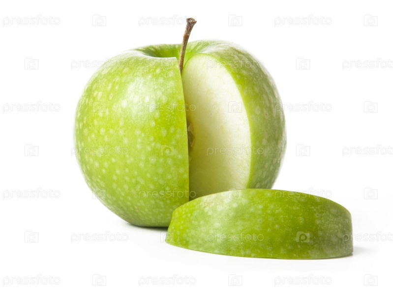 Зеленое яблоко с вырезанной долькой на белом фоне