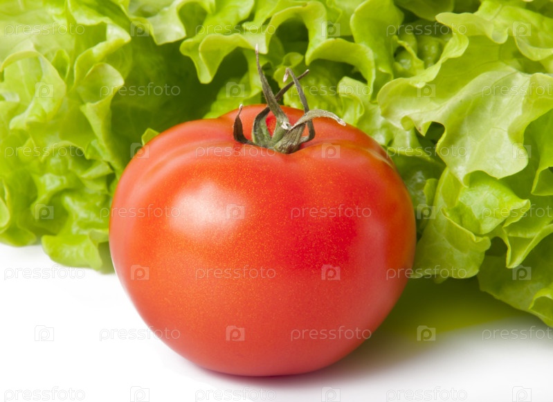 Красный помидор с листьями салата на белом фоне