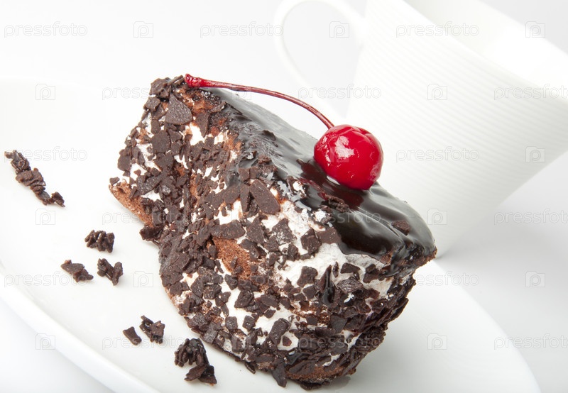 Пирожное с вишней и чашка кофе на белом фоне