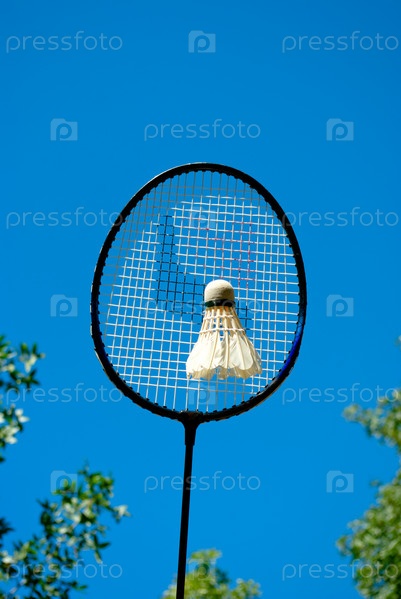 Воланчик и ракетка для бадминтона на фоне голубого неба