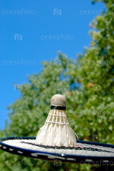 Воланчик и ракетка для бадминтона на фоне голубого неба