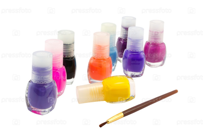 Лак для ногтей различных цветов и кисточка на белом фоне