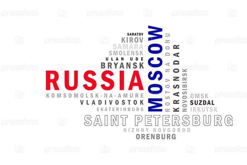 Коллаж из названий городов России на белом фоне