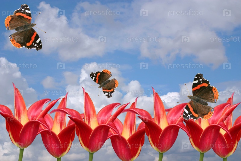 Красные тюльпаны и бабочки на фоне неба