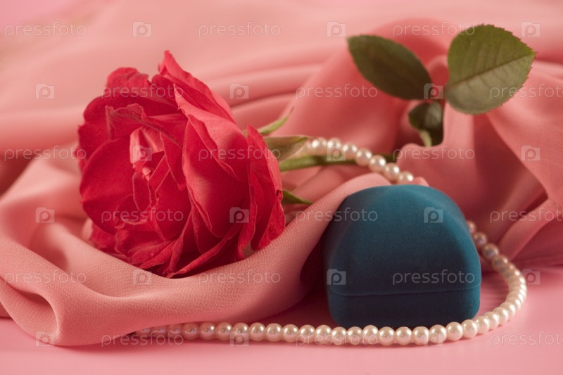 Красная роза, подарочная коробочка и бусы на шелковой ткани
