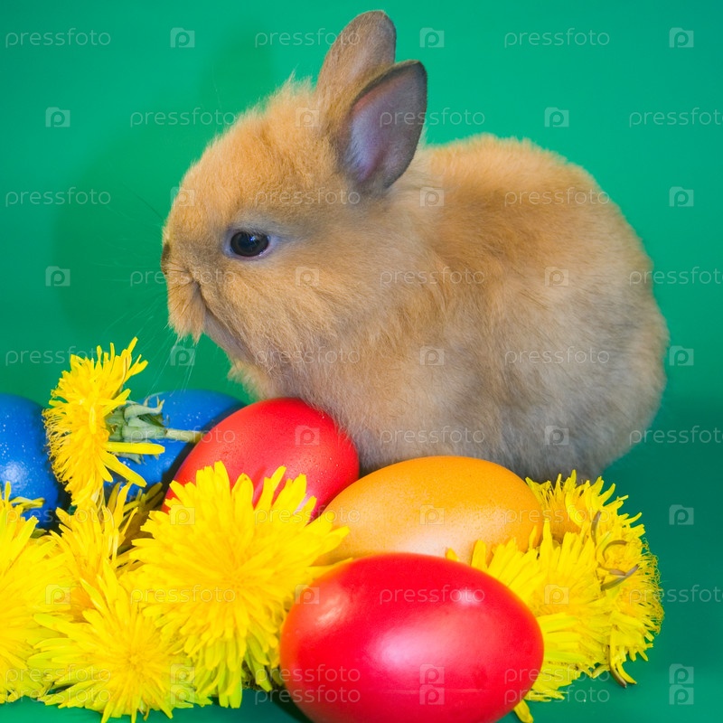 Коричневый кролик, пасхальные яйца и желтые одуванчики на зеленом фоне