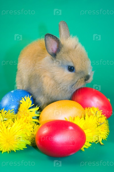 Коричневый кролик, пасхальные яйца и желтые одуванчики на зеленом фоне