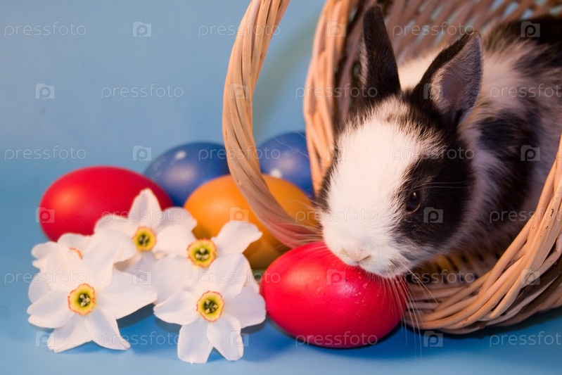 Черно-белый кролик в плетеной корзине, белые нарциссы и пасхальные яйца на голубом фоне