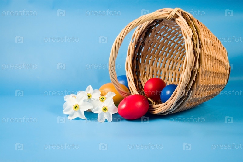 Опрокинутая плетеная корзина с пасхальными яйцами и белыми нарциссами на голубом фоне