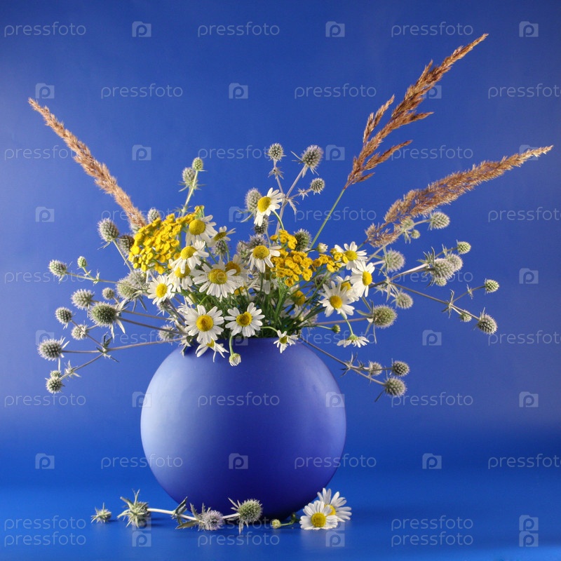 Букет полевых цветов в синей вазе
