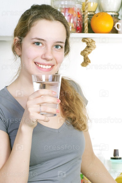 Красивая женщина пьет воду на своей кухне