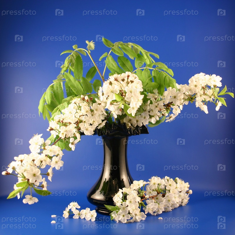 Букет белой сирени в вазе на синем фоне