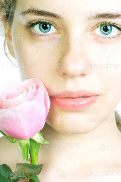 Портрет молодой красивой женщины с розовым цветом на белом фоне