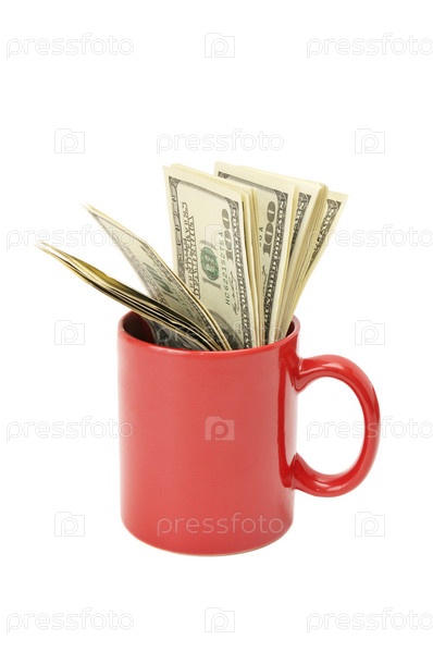 Доллары в кружке, изолированной на белом фоне