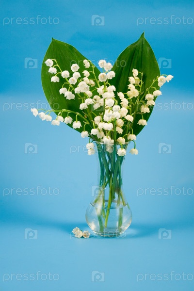 Букет ландышей в вазе на голубом фоне