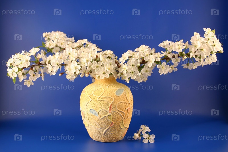 Веточки вишни с белыми цветками в вазе на синем фоне