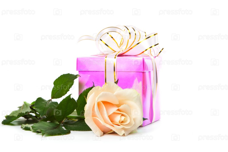 Подарок в розовой блестящей упаковке и большая яркая роза на белом фоне