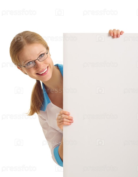 Симпатичная молодая врач с пустой доской в руках на белом фоне