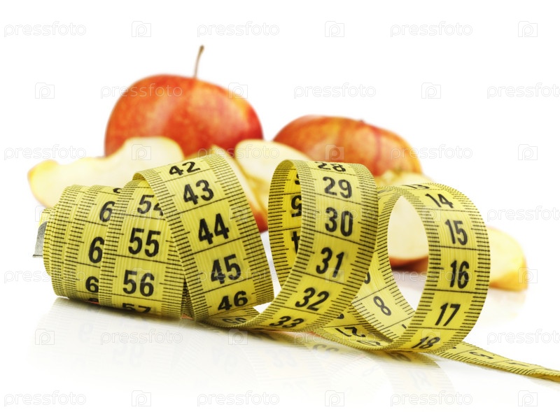 Целые и нарезанные яблоки и сантиметр на белом фоне