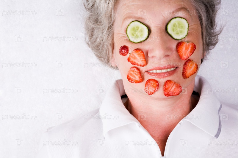 Лицо зрелой женщины с нарезами огурцов и клубники на нем
