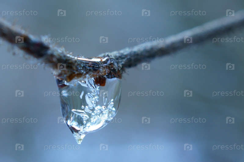 Заледеневшая капля воды на ветке
