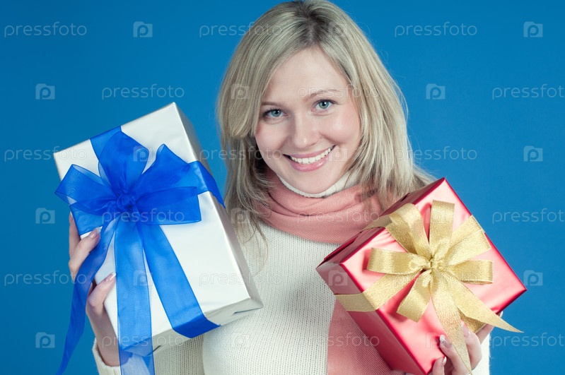 Счастливая молодая женщина с подарками на голубом фоне