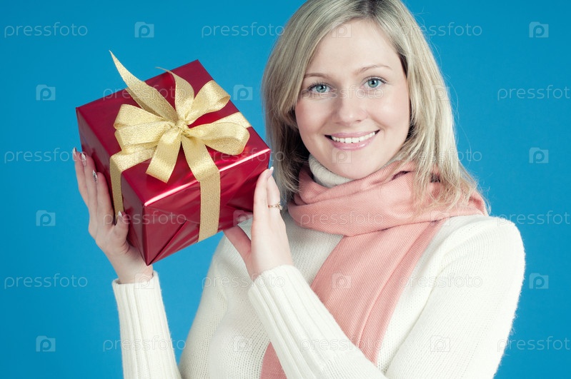Улыбающаяся светловолосая девушка с подарком на голубом фоне