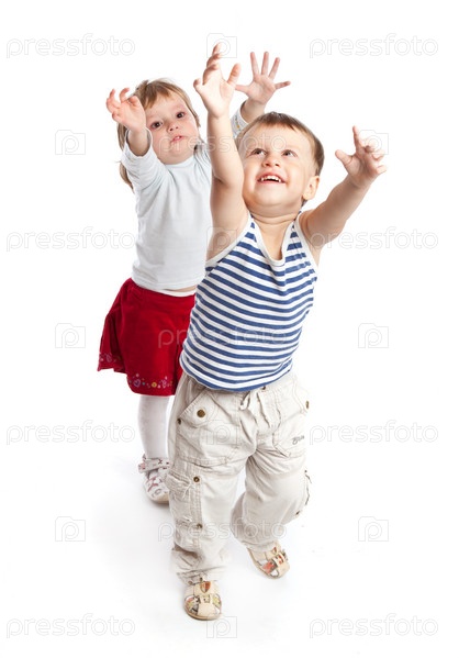 Маленькие мальчик и девочка ловят что-то сверху на белом фоне