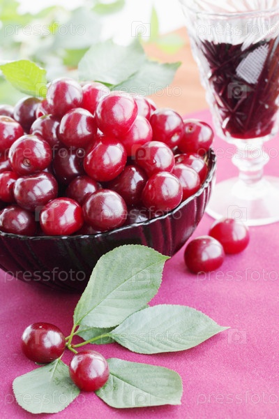 Свежие вишни в чашке и вино