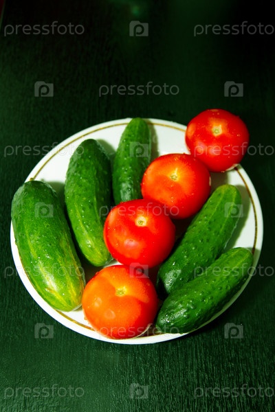 Красные помидоры и зеленые огурцы в белой тарелке на зеленом фоне