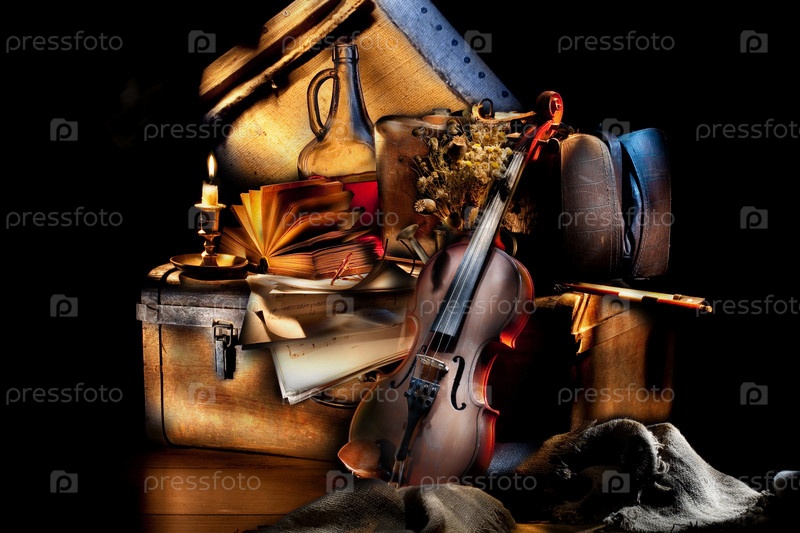 Натюрм с скрипкой, свечой и деревянным чемоданом сделано Light brush