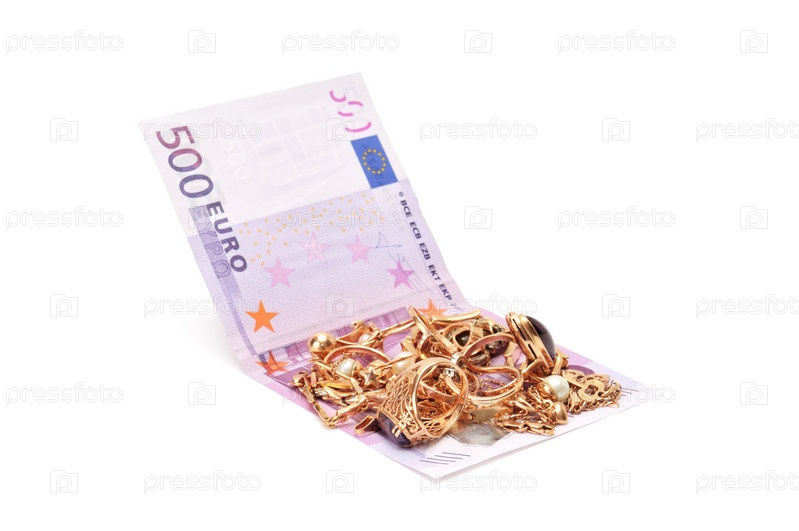 Золотые украшения и купюра евро, изолированные на белом фоне