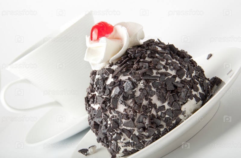 Пирожное с шоколадкой крошкой и чашка крупным планом