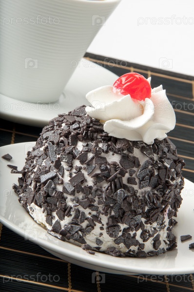 Пирожное с шоколадкой крошкой и чашка крупным планом