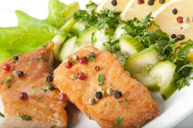 Жареная рыба с зеленью и овощами