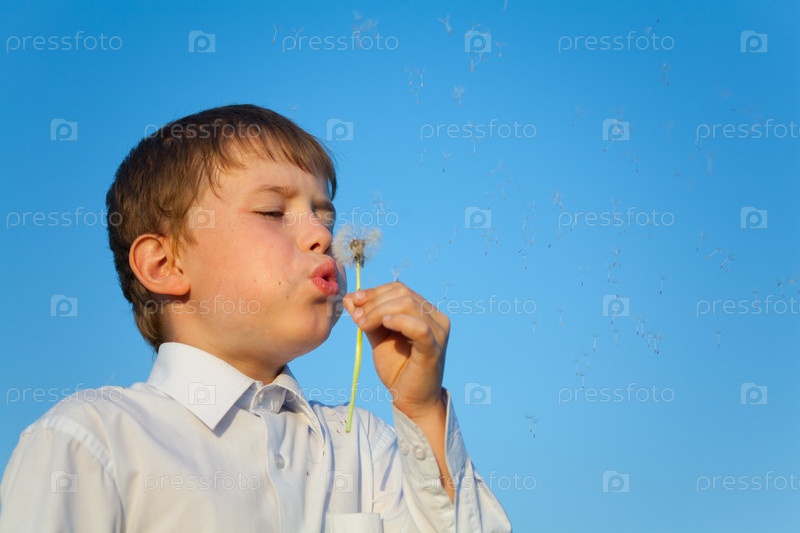 Мальчик дует на одуванчик, стоя на фоне неба