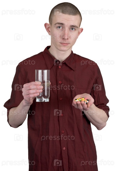 Парень со стаканом воды и таблетками на руках