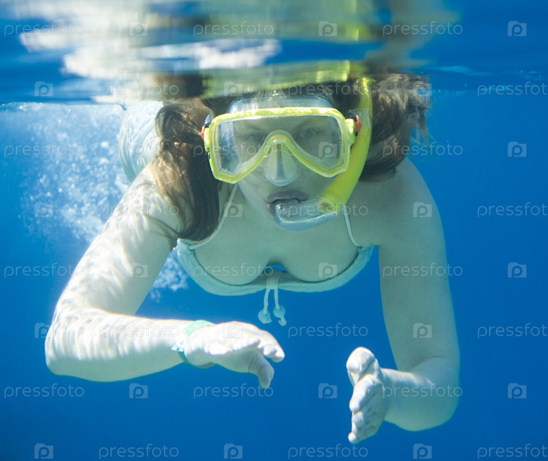 Девушка в маске для дыхания плавает под водой