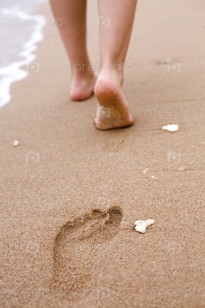 Ноги женщины, идущей по пляжу вдоль прибоя