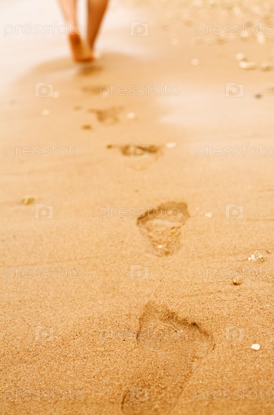 Следы ног женщины, идущей по пляжу вдоль прибоя